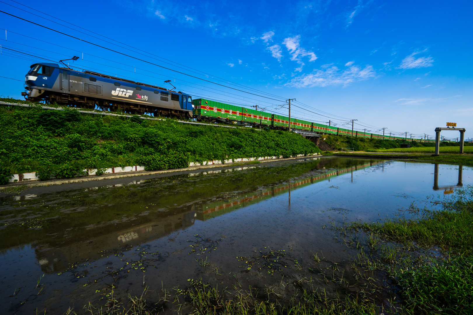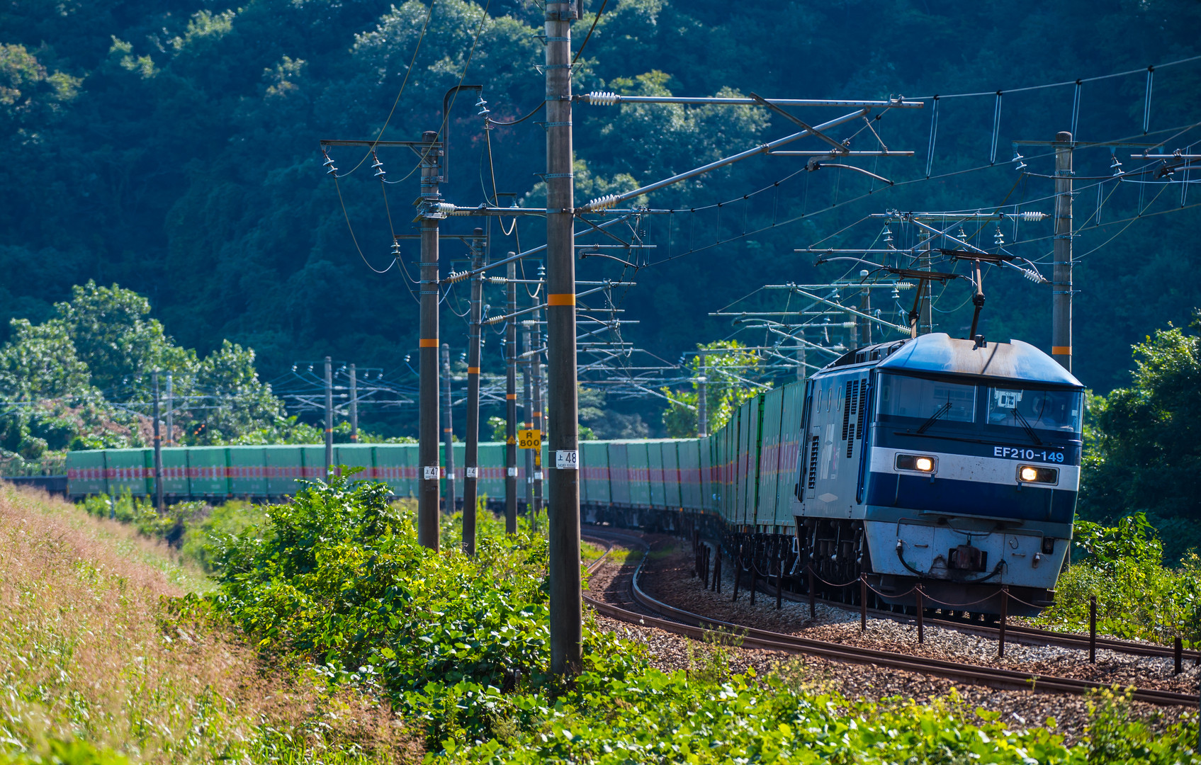 ようやく捉えた貨物列車。グリーンのコンテナ一色の貨物列車をご覧ください。
