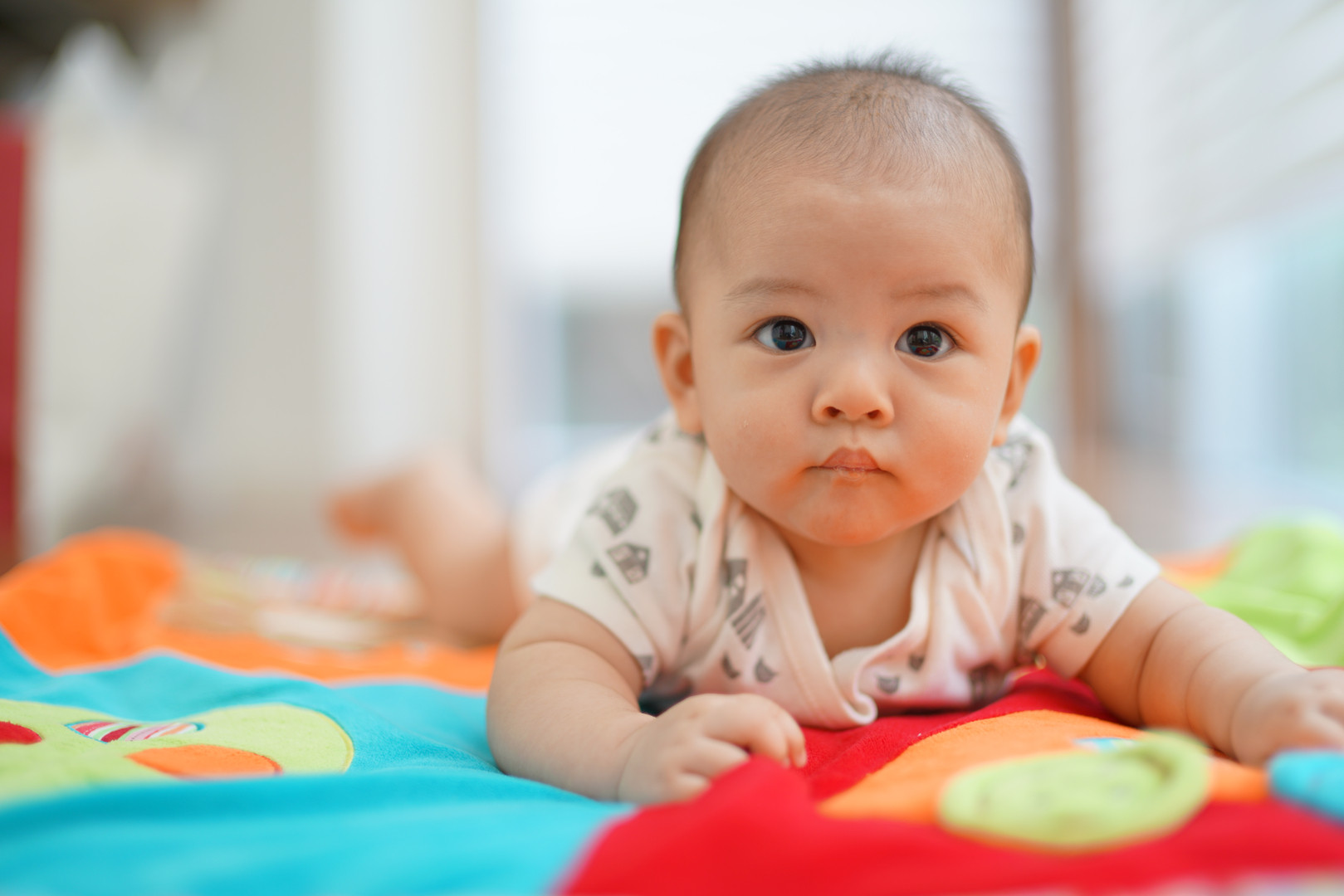 元気いっぱいな被写体。刻一刻と表情を変えます。 MFでピンと合わせた大変。 寝返りはできるようになりましたが、寝返ってから何をするか…本人もいまだ悩んでいるようです。
