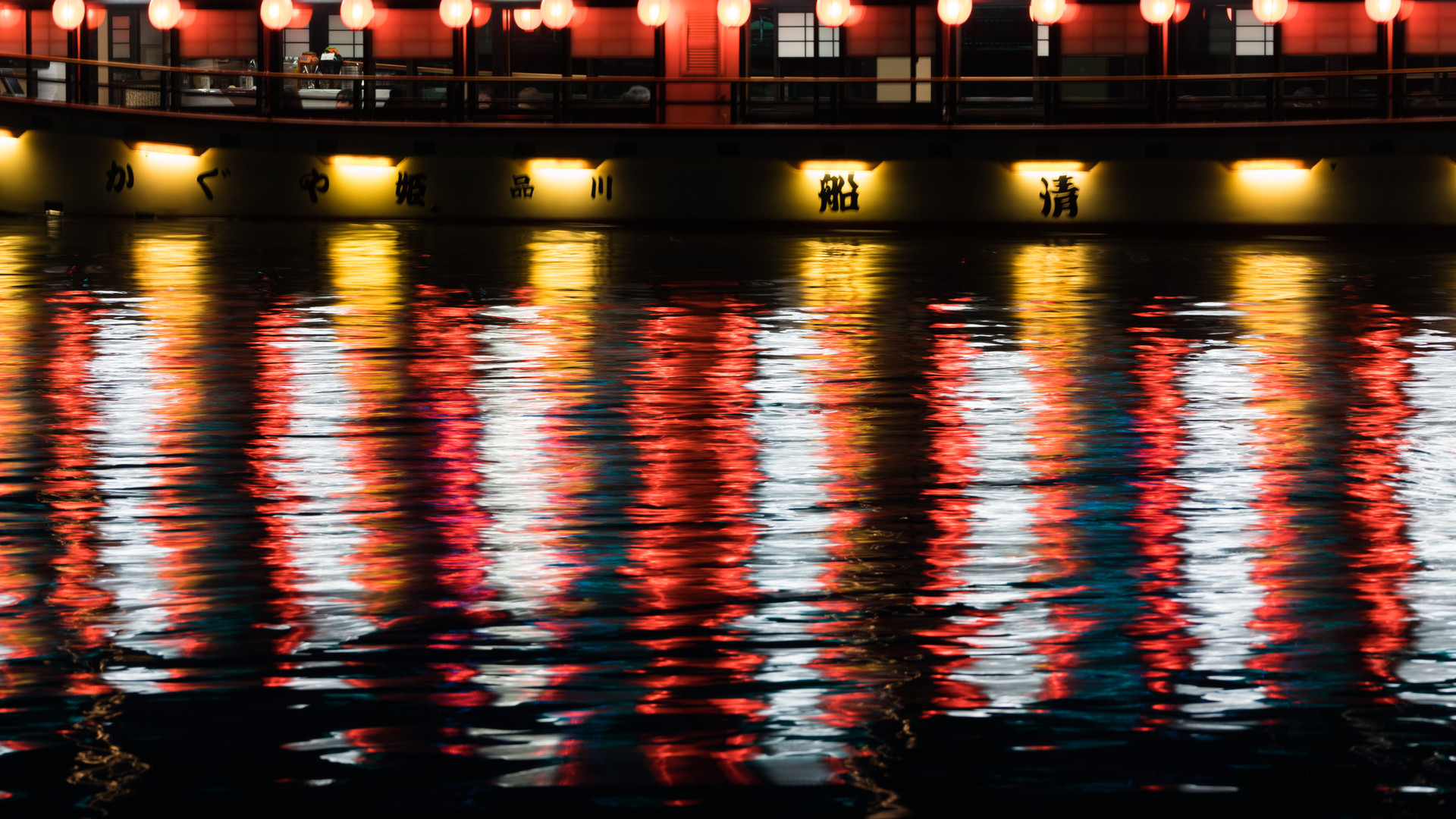 川面に映った屋形船は、まるで紅白幕のようでした。