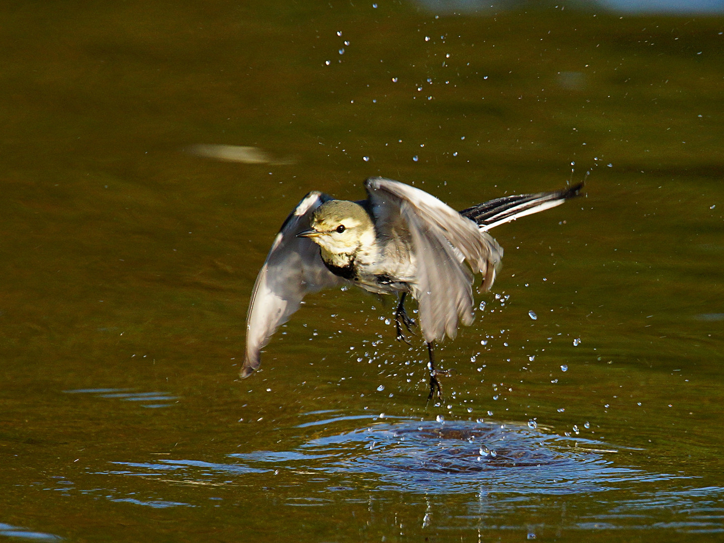 まだ顔もくちばしも黄色いハクセキレイの若鳥が、水浴びして飛び立つところです。 (前回の”ピヨちゃん”とは別個体です)