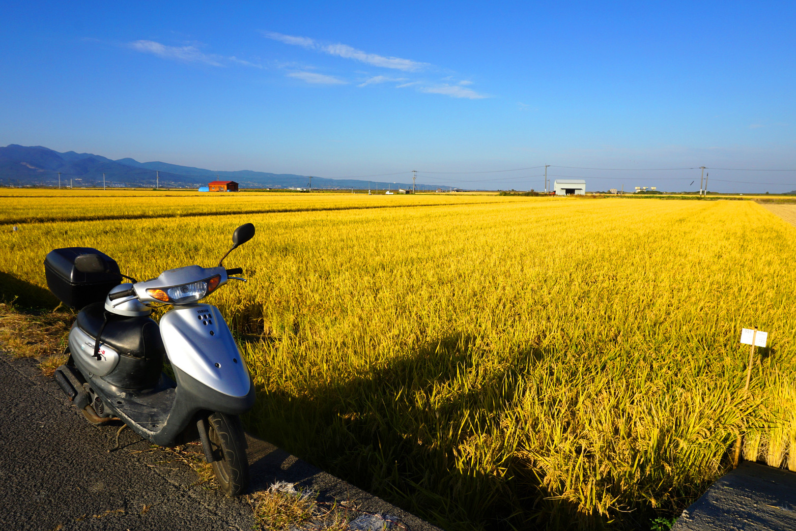 島原半島を北上中、一面の橙色に輝く稲穂の景色に遭遇、思わず車を止めてパチリ。はるかに続く諫早平野と青空に感動の一枚です。