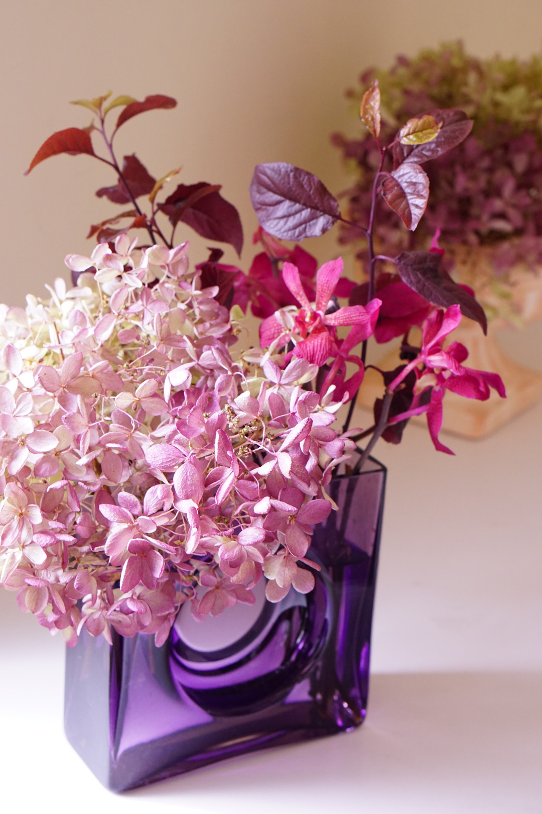 お気に入りの花器に秋色の花を飾りました。