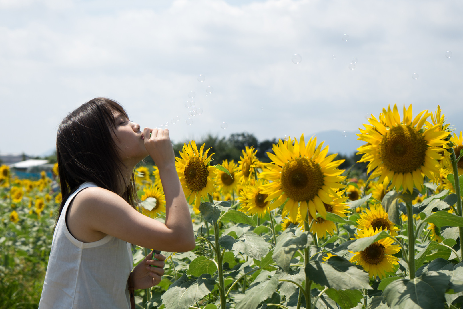 美女とひまわりとシャボン玉の共演です。