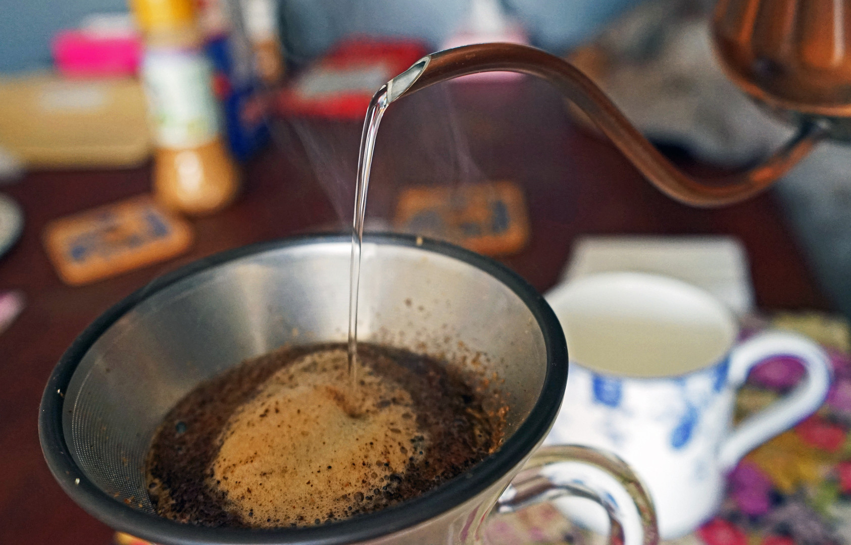 わが家の朝の一こまをご紹介します。左手でシャッターを押すのに苦労しながらの撮影です。