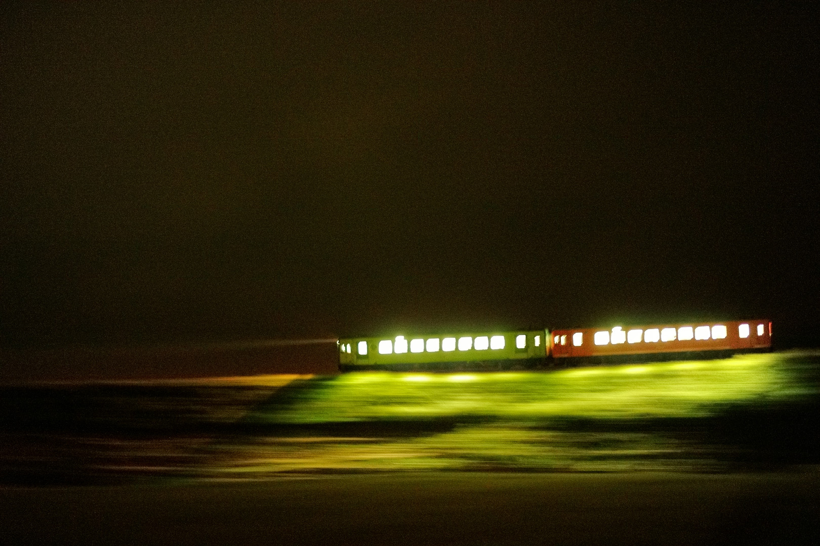 真っ暗な土手の上を田圃を照らして走ります。