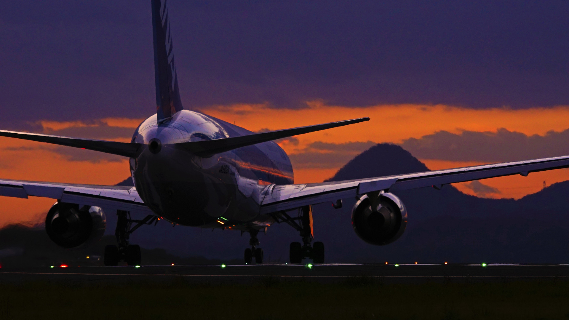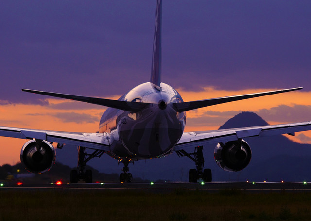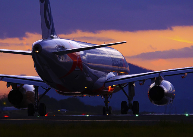 高松空港、日が沈んで雲の間に残照の残る中、滑走路の東の端から出発です。
