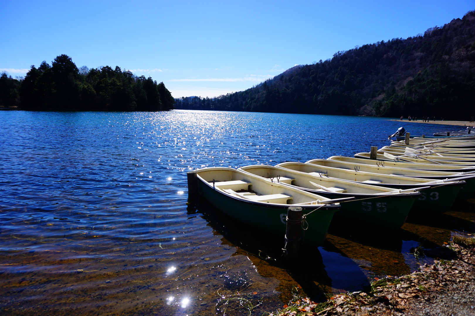 光を反射した水面に浮かぶ貸しボート。 係員さんが清掃していましたが、寒さのせいか、一槽も出でいませんでした。
