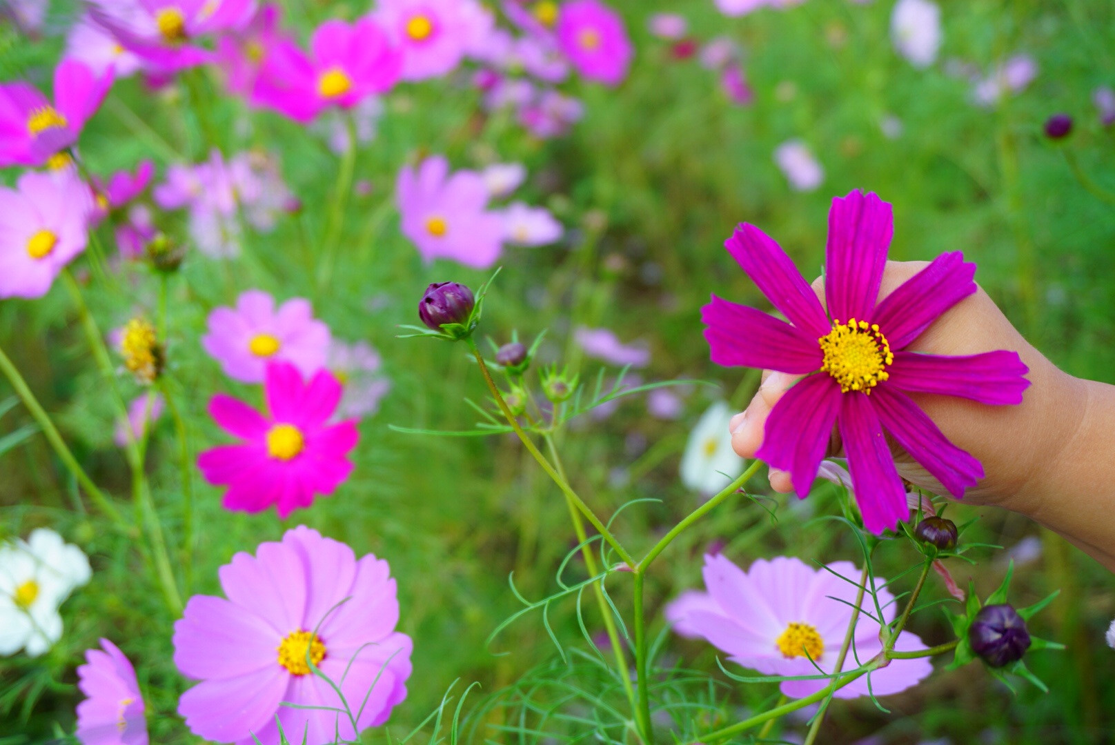 少し前に娘とコスモス畑へお散歩にきた時に、コスモスだけで撮ろうとシャッターを押したら娘の手も入ってて素敵な一瞬が切り取れました。