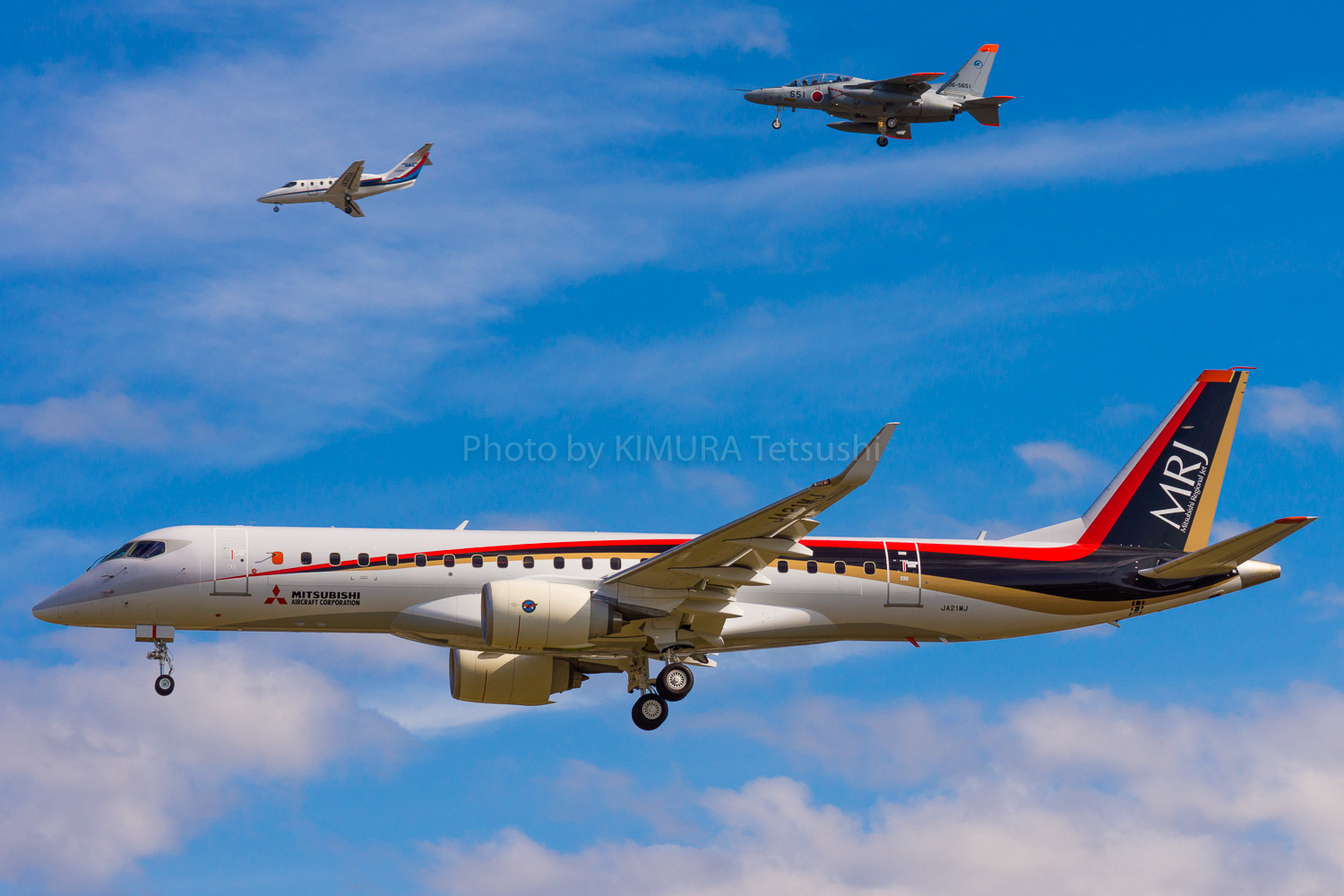 歴史的な初飛行を見てきました。チェイスプレーン2機(航空自衛隊のT4とダイアモンドエアサービスのMU-300)も一緒に撮れました(写真に写っていないところにもう一機のチェイスプレーンがいます)。