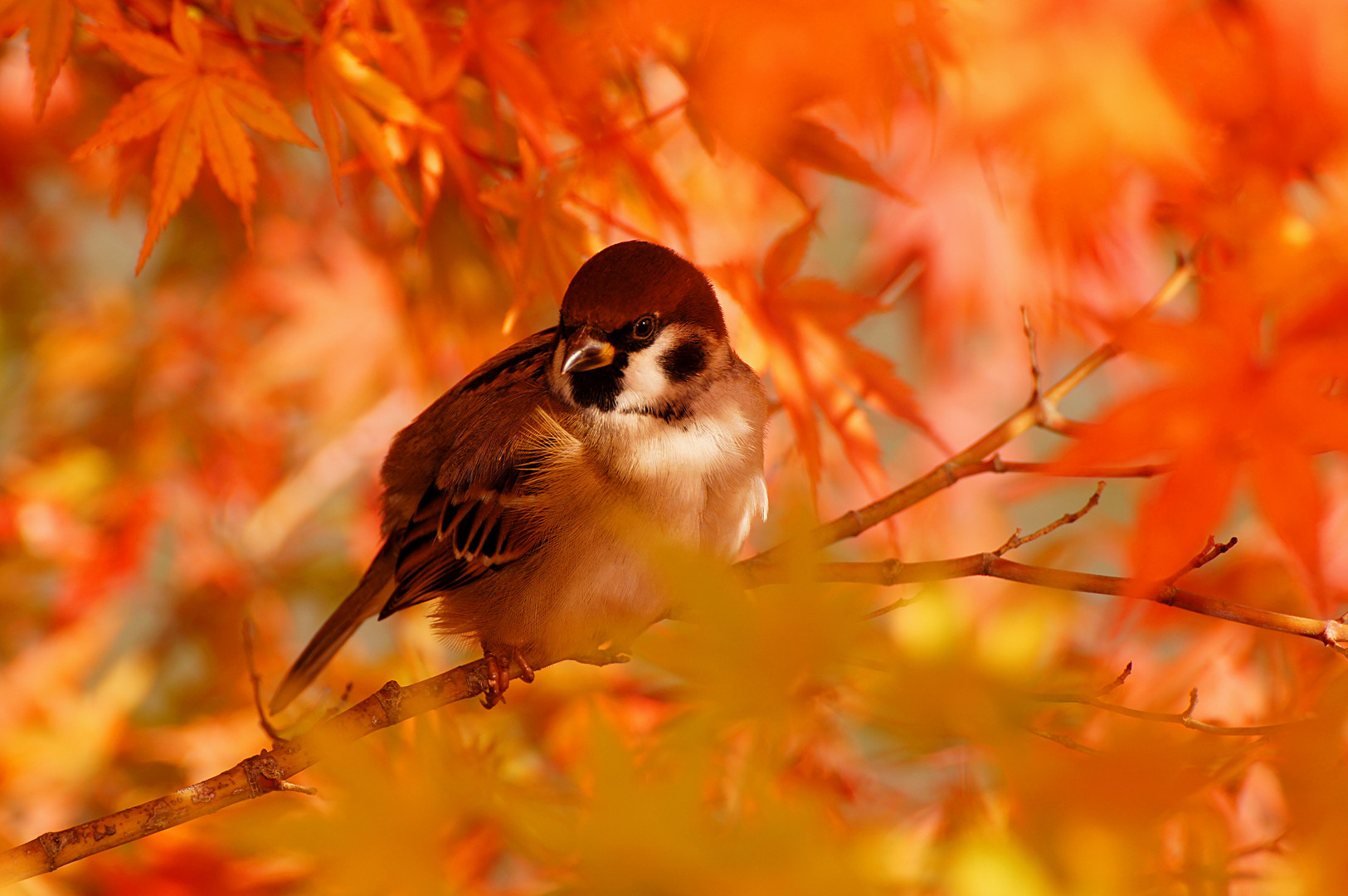 今年生まれたくちばしの黄色いスズメちゃん、初めての紅葉です。 検索用 ”雀” #スズメ#