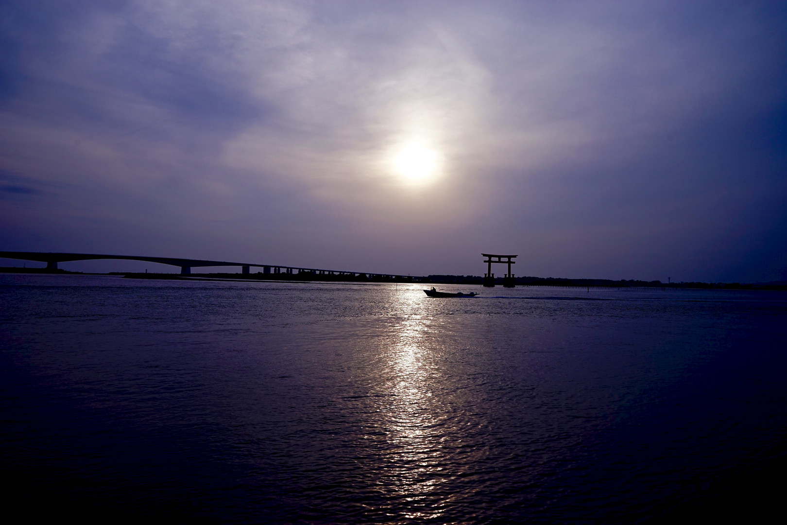 鳥居に太陽が入る画を撮ろうと浜名湖に行くが鳥居に入る前に雲に太陽が飲み込まれ・・・ かなり強引に夕暮れぽっく色温度調整(爆