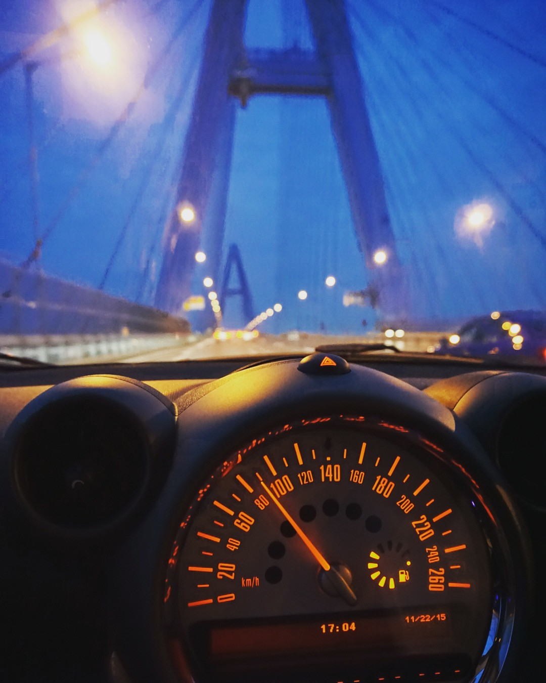 ミニクロスオーバーの助手席より。 名古屋モーターショー2015の帰り道、名港トリトン走行中に。 日が落ちるのが早くなったので工場夜景もキラキラしてました