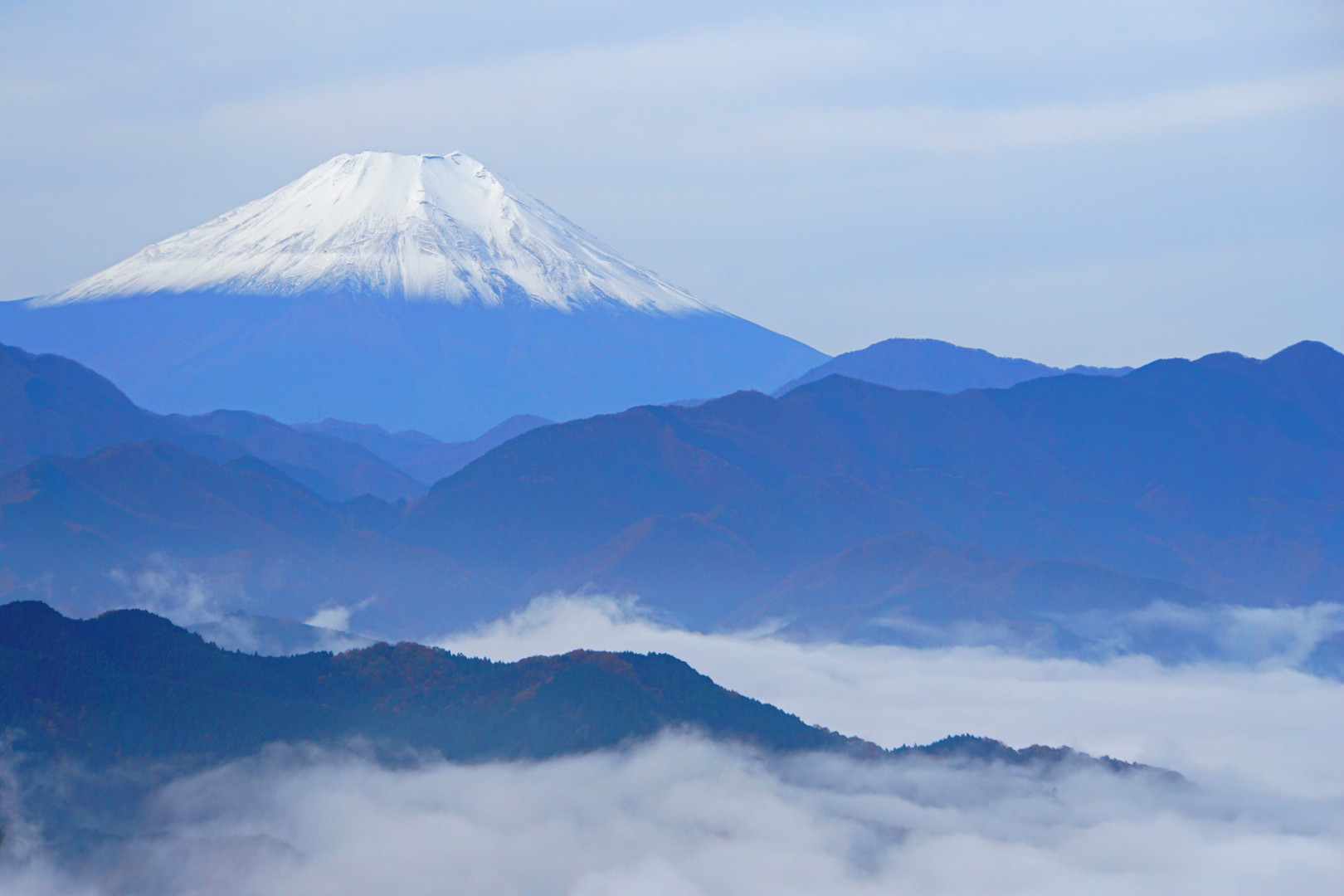高尾山山頂からの富士山です。やはりどこから見ても素晴らしい山です。 登山中はずっとガスっていましたが、山頂に着いた直後、雲海の上に顔を出しました。