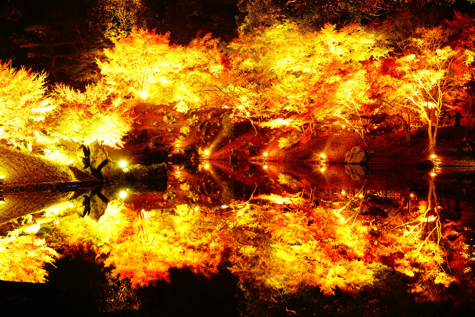 栗林公園ライトアップ最終日( ´ ▽ ` )ノ 風もなく寒くもなくいい感じです。 今現在の様子。掬月亭近くで(≧∇≦) 映り込みもいい感じ。