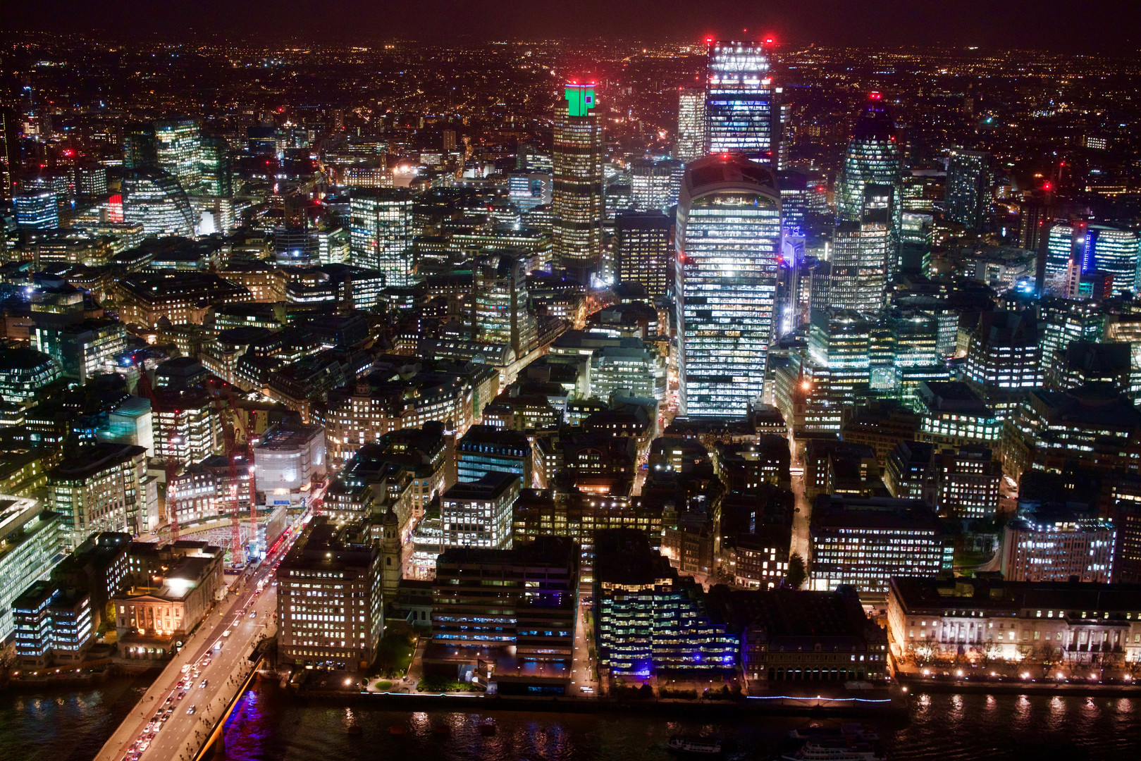ロンドンの展望施設「The Shard」から、金融街City方面を撮影しました。 夜と昼の風景をお届けします。 左下はロンドン・ブリッジです。 展望施設の高さは244mで、ロンドンを360度見わたせます。