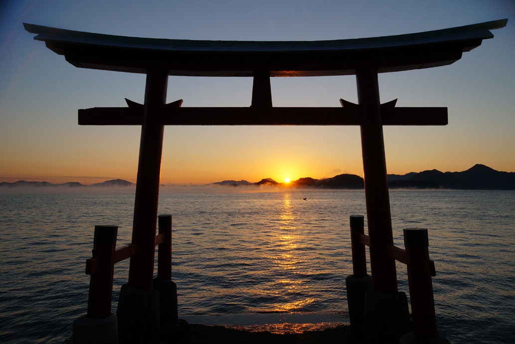 広島市・三原市須波の夜明けです。鳥居の間から豆粒のような朝日が昇っていきます。