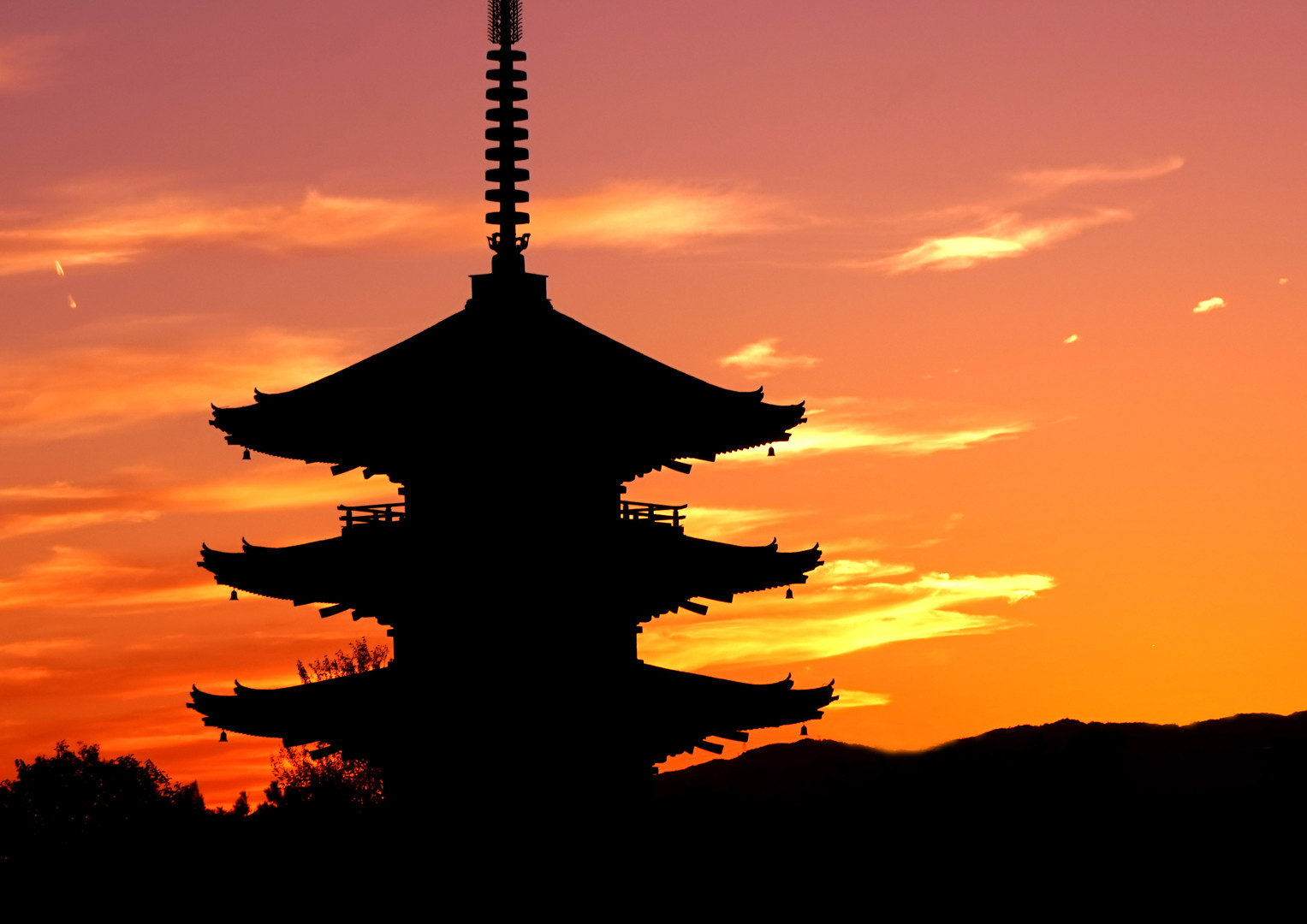 沈みゆく太陽と、八坂の塔シルエット