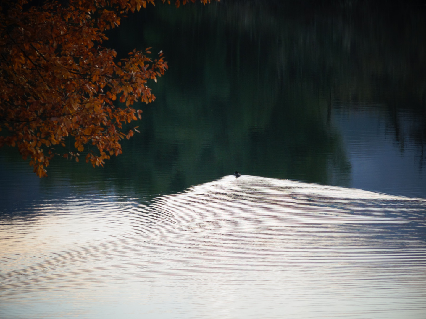 微かな夕日が感じられる湖面に鴨が波紋を残しています。