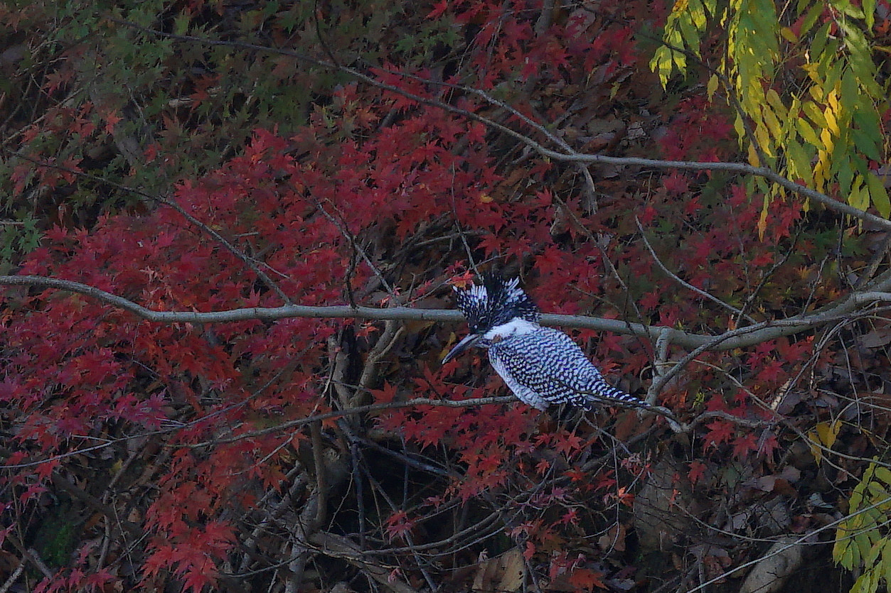 遠くて暗い枝に止ってくれたヤマセミ様。あまり解像してません。紅葉を背景にした証拠写真程度ですが貴重な一枚でした