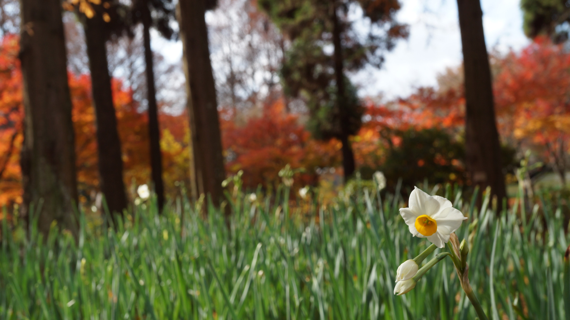 咲き始めたのはいいのですが、紅葉も遅れて今真っ盛りなのでなんだか季節感がグチャグチャです。
