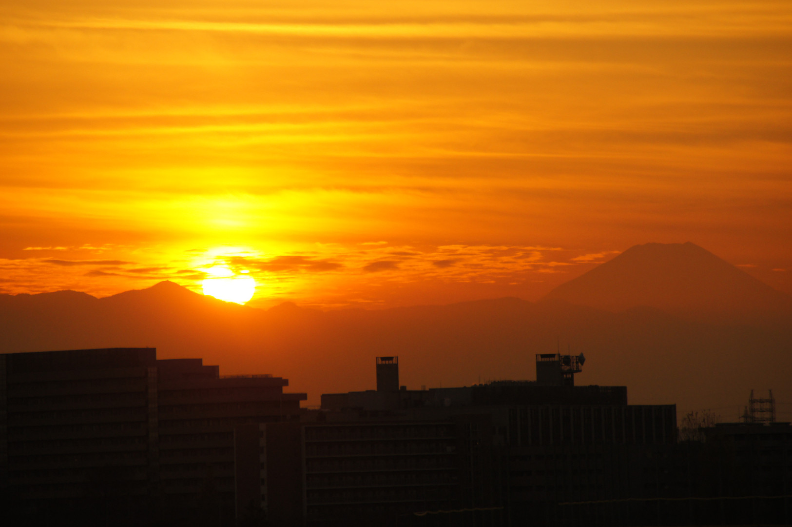 夕日がきれいそうだったので、近所の丘に行ってみました。 夕日と富士山が両方見られてラッキーでした。 雲と太陽の関係が面白かったので、形の変わった太陽のほうを投稿しました。