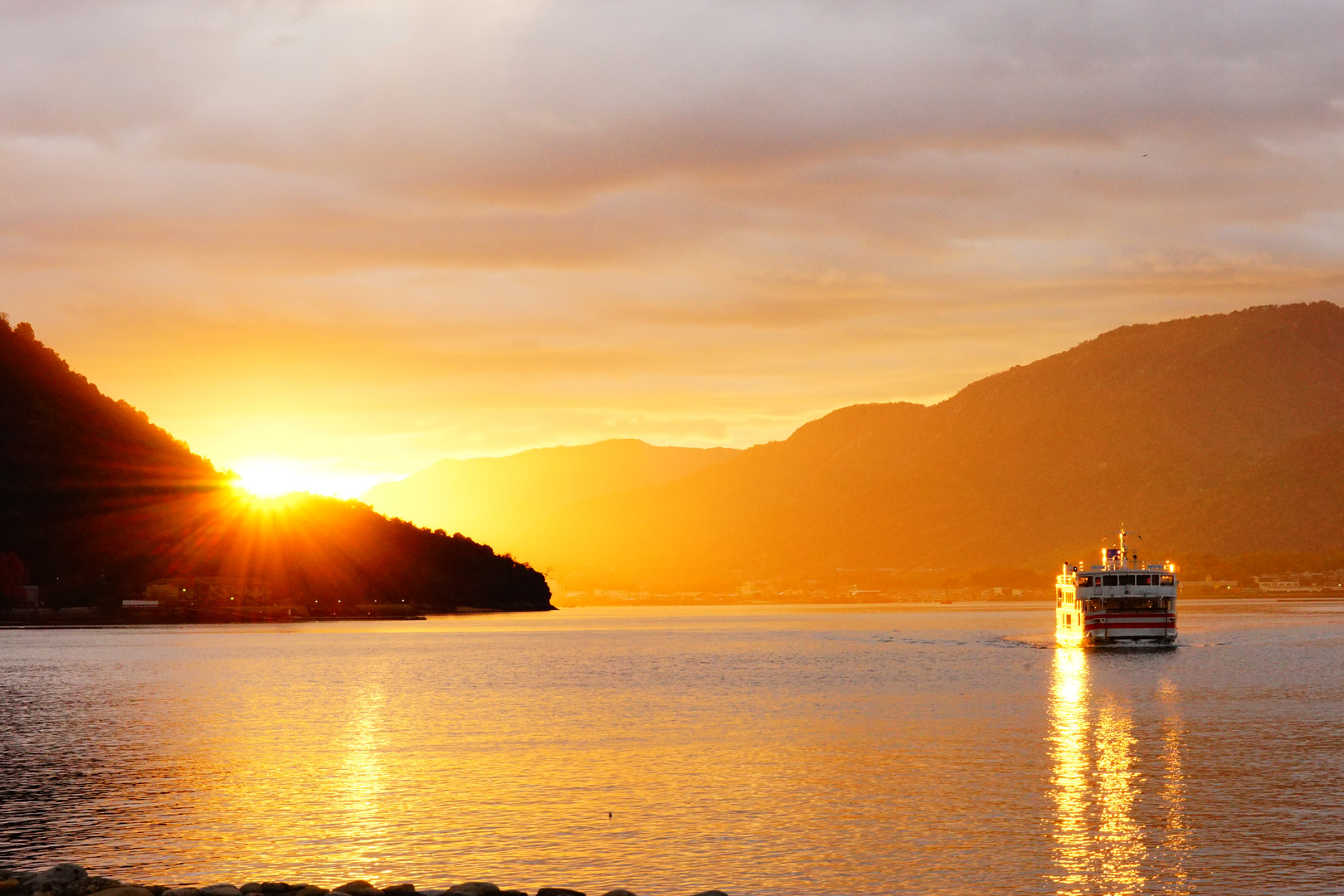 夕日に照らされた宮島フェリーです。