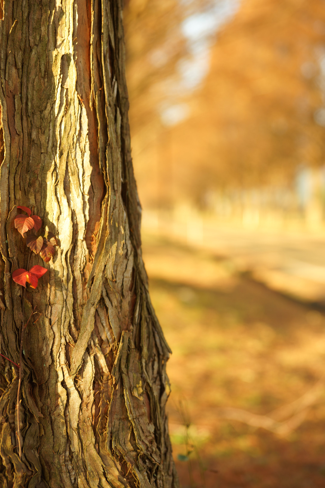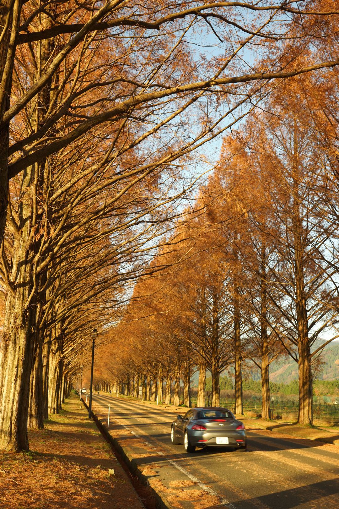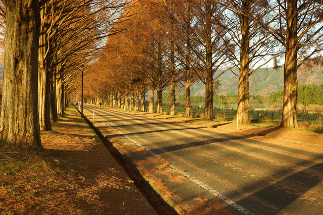 メタセコイアのトンネルも、轍で縞模様になった落ち葉の道も。