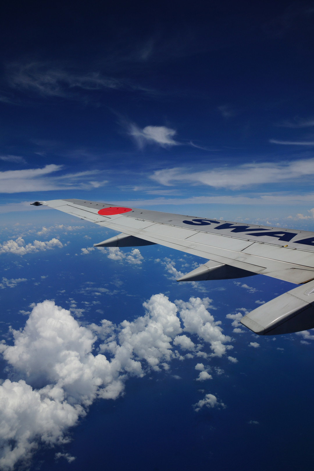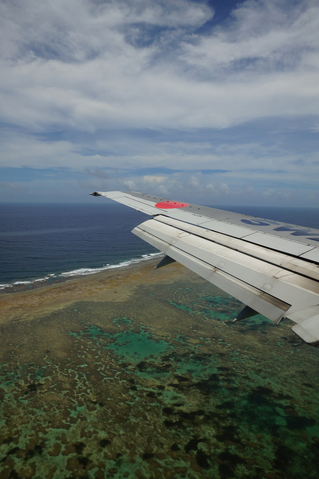 飛行機の窓から。 ソラの青と海の青。う~ん、いい勝負だ。