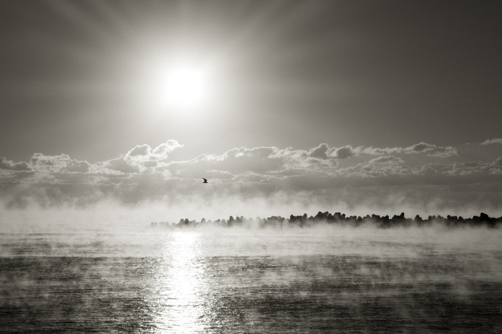 冷え込んだ朝に辺り一面海からの水蒸気でまるで雲のようでした