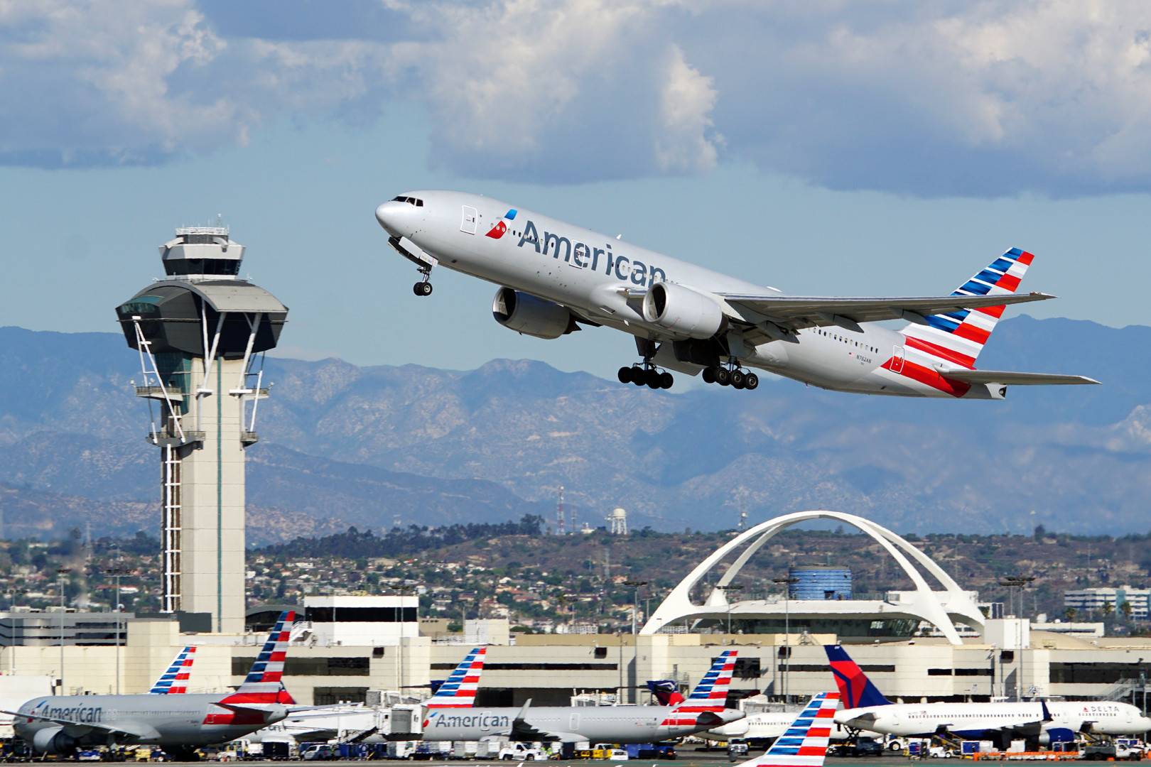 お次は滑走路中ほどにある高台より撮影 ロサンゼルス国際空港の特徴的な建物を背景に入れることができました(ちなみにアーチ状の構造物の中にはレストランが入っています) アメリカン航空777-200、気付けば周りはアメリカンだらけですね。