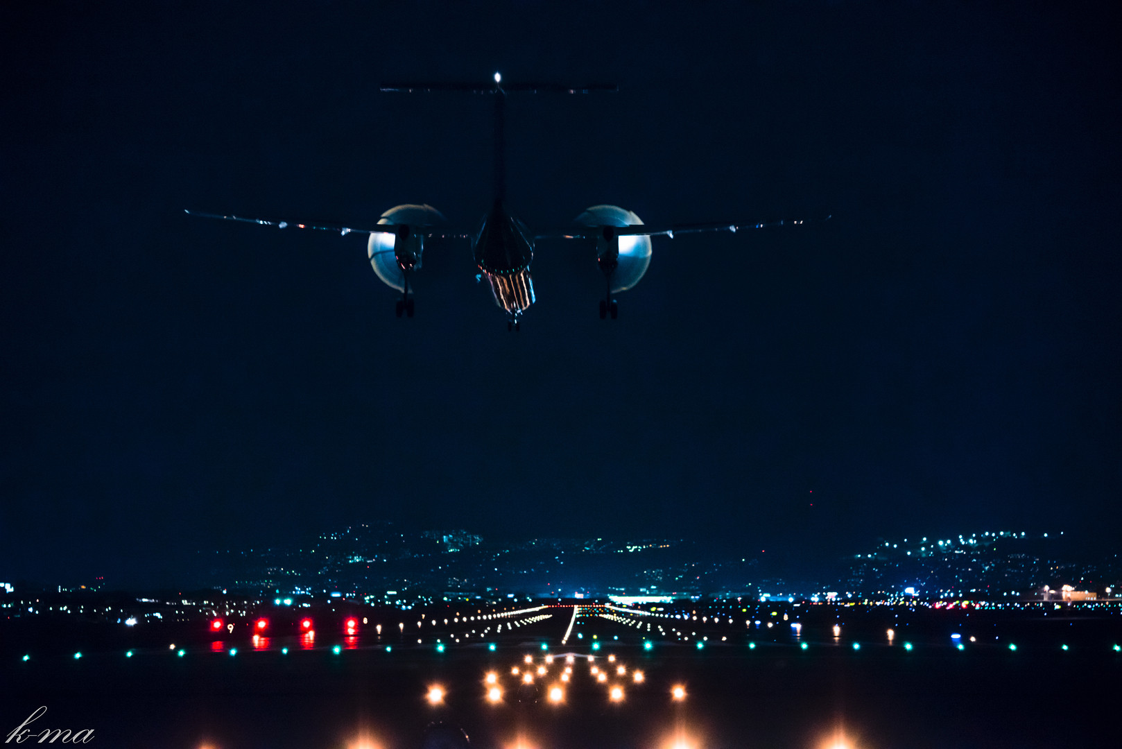 伊丹空港の千里川土手で飛行機を撮影しました。 SONYのカタログのような写真を意識しましたが遠く及びませんでした。 プロペラ機のプロペラがライトアップされて素敵でした。