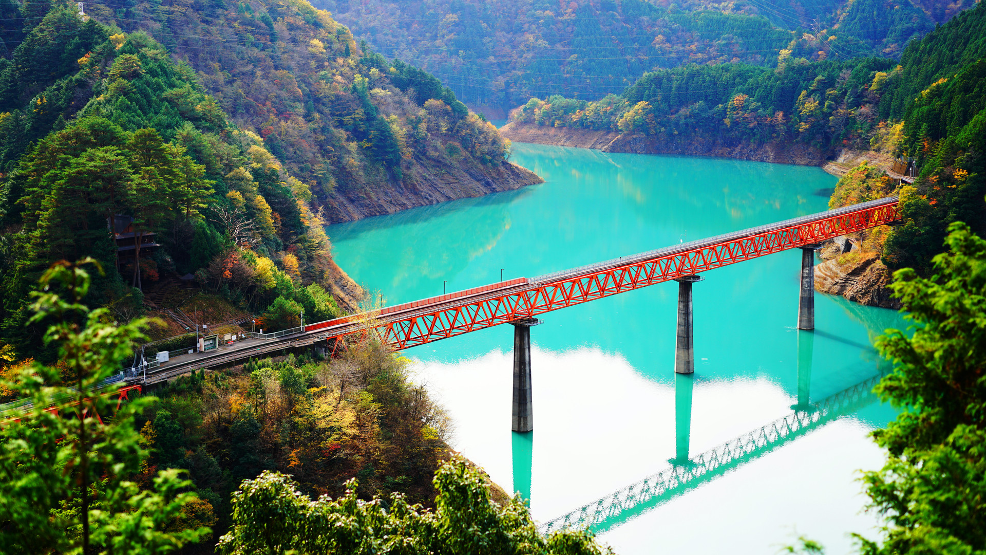 念願かなって、大井川鉄道の奥大井湖上駅に来ることができました! 朝方まで降ってた雨があがり、紅葉に雲間から日が射して、水面が見事な色に染まりました。