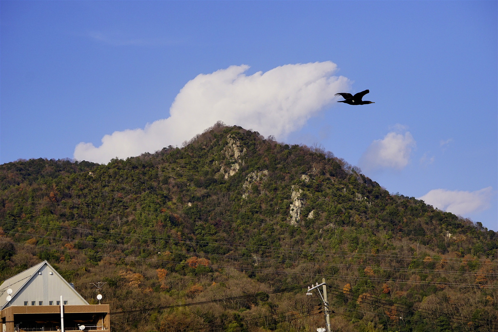 山頂の白雲を意識していたら、何かが飛んだのを感じてシャッターを押しました