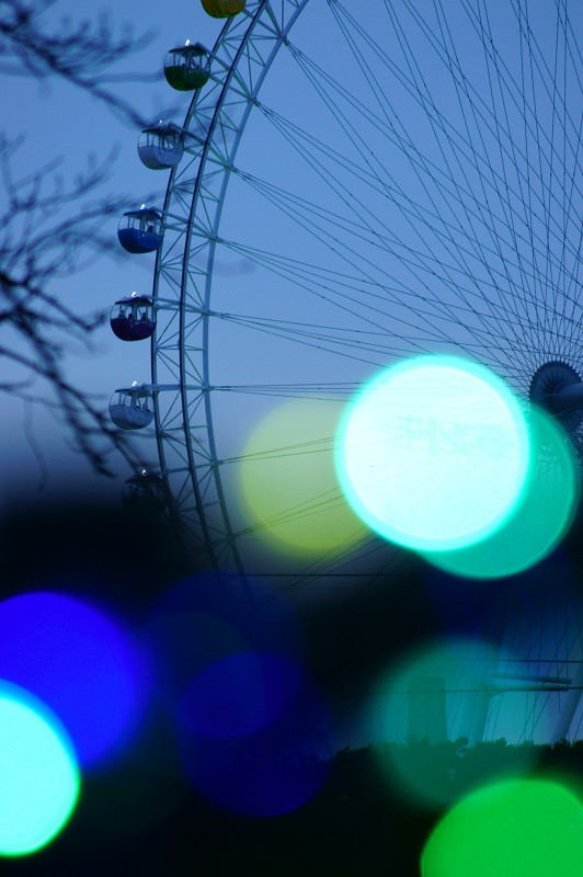 イルミネーション、観覧車、夕暮れ。 手前の光をぼかして幻想的にしてみました。