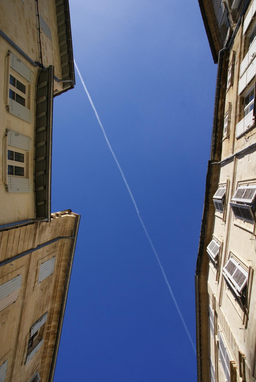 アビィニヨンの路地裏で食事中、たまたま真上にできた飛行機雲