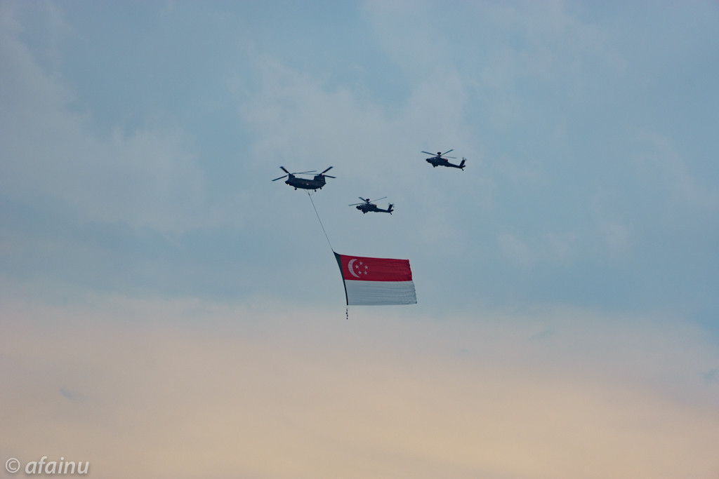 8月9日のナショナルデー(シンガポール建国記念日)の当日、セレモニー会場は国民と永住権保持者しか入れないので、スポーツハブ(サッカーワールドカップ予選の日本戦が行われたナショナルスタジアムのあるところ)でライブビューと空のイベントを観覧しました。遠くにマリーナベイサンズも臨めますし、マリーナ上空を飛んだ飛行機やヘリコプターはこちら方面へ飛んでくるのでなかなか良い選択でした。