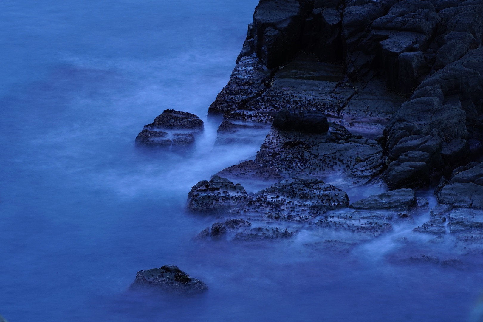 福井県東尋坊にて。日が沈んだ後のブルーな時間を岩と波で表現しました。