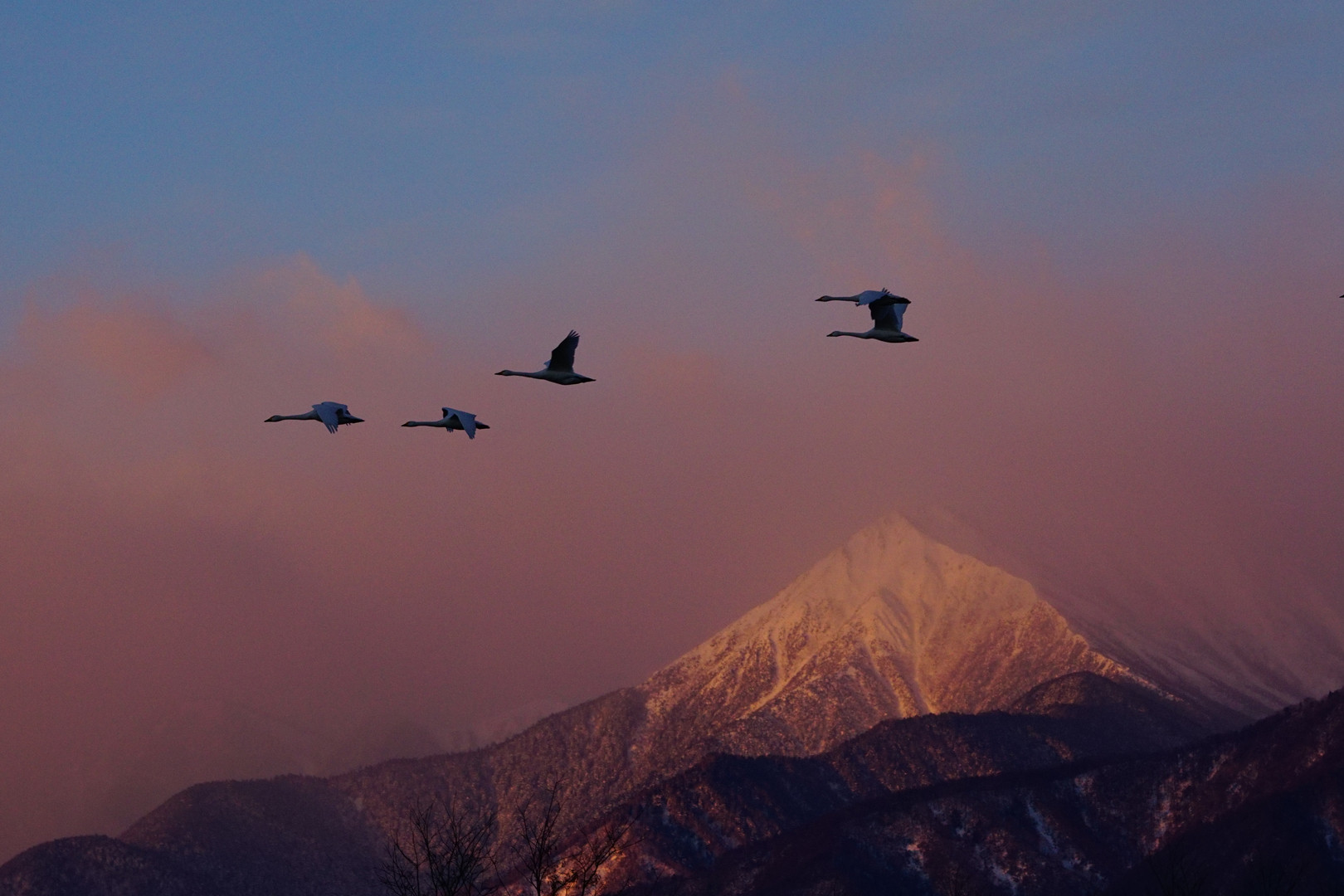 朝焼けでピンクに染まった雲、絶好のタイミングで白鳥が飛んできました。