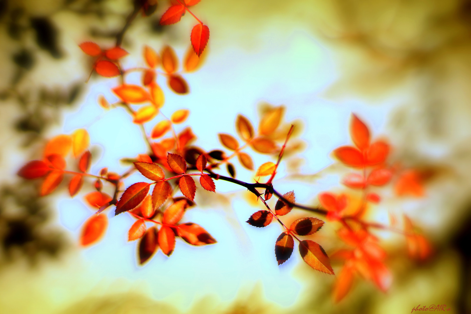 散歩道にこの時期、小さなバラが咲きます。 葉が赤く染まっています♪ NIKKOR 50mm f1.4使用。