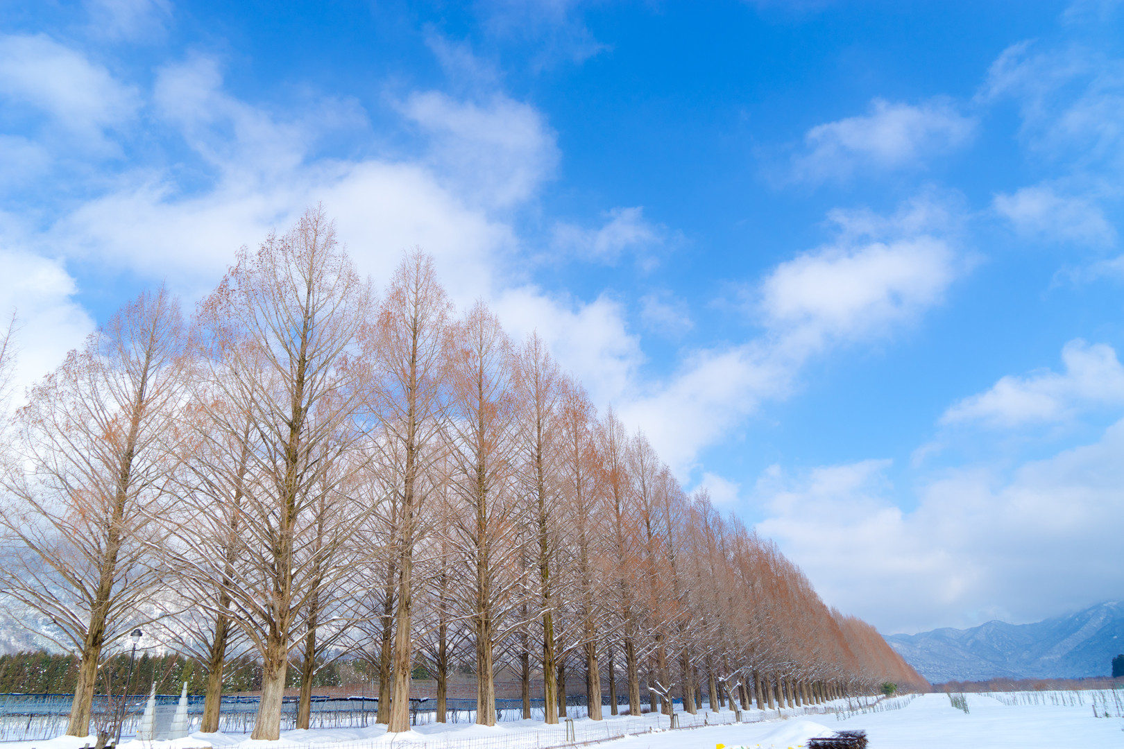 どこまでも続くかのように見える滋賀県のマキノにあるメタセコイア並木です。