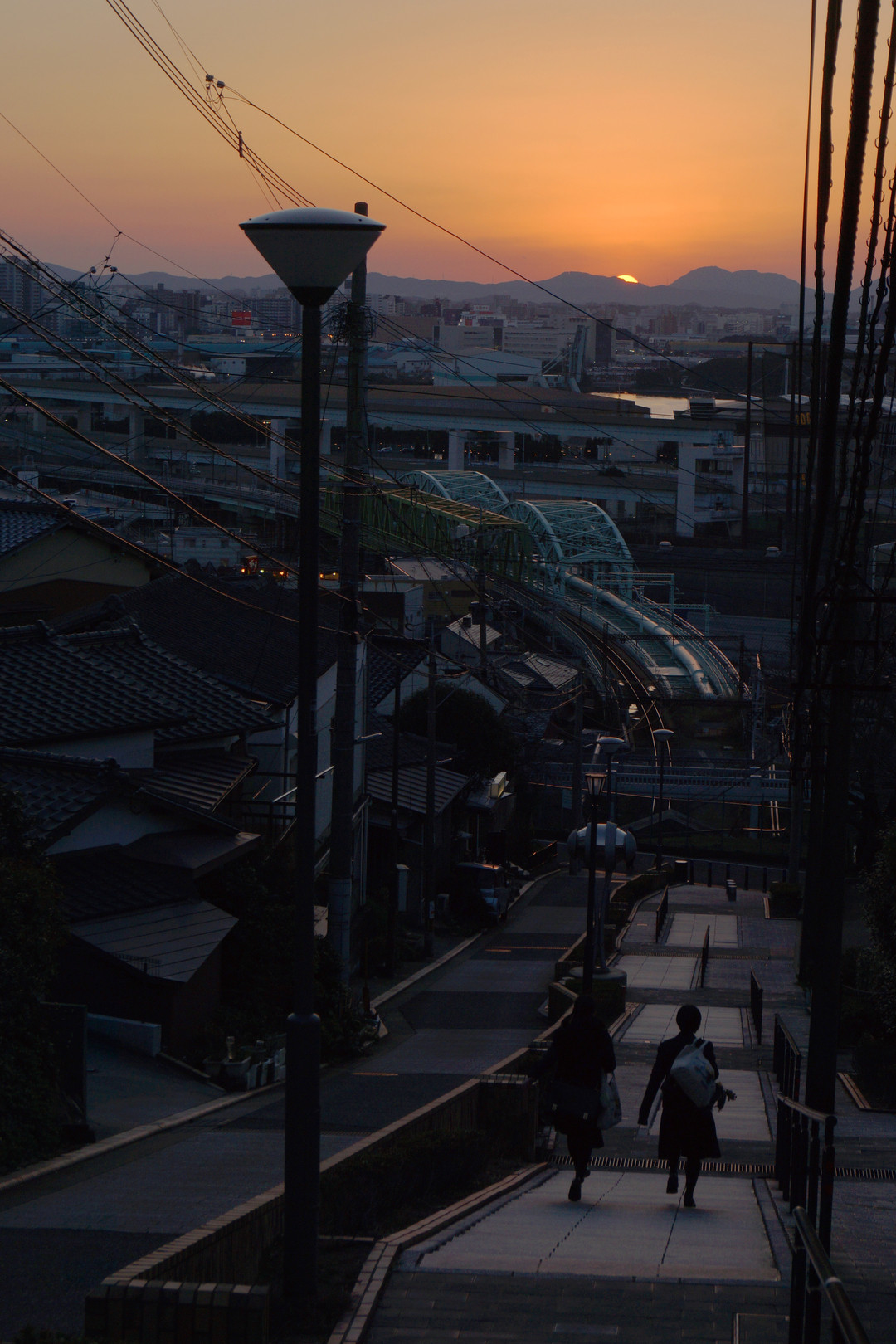 八幡東区の望玄坂の夕焼け、学生が上り下りする階段 新日本製鐵の専用鉄道「くろがね線」 「宮田山トンネル直上」が一直線に歩道になっている。