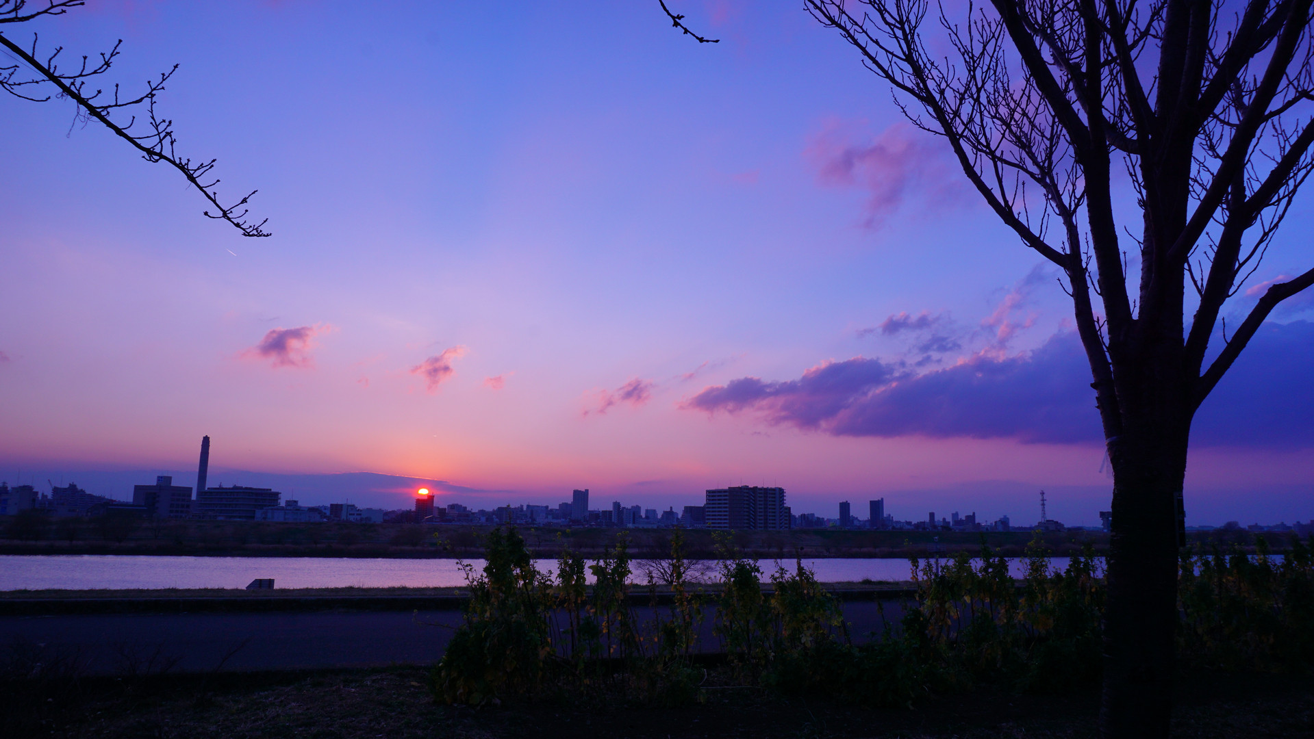 今日も荒川土手で撮影。 太陽が雲に隠れ、下まで沈まず、富士山のシルエットも出なかったので、急遽空を撮ることにしました。