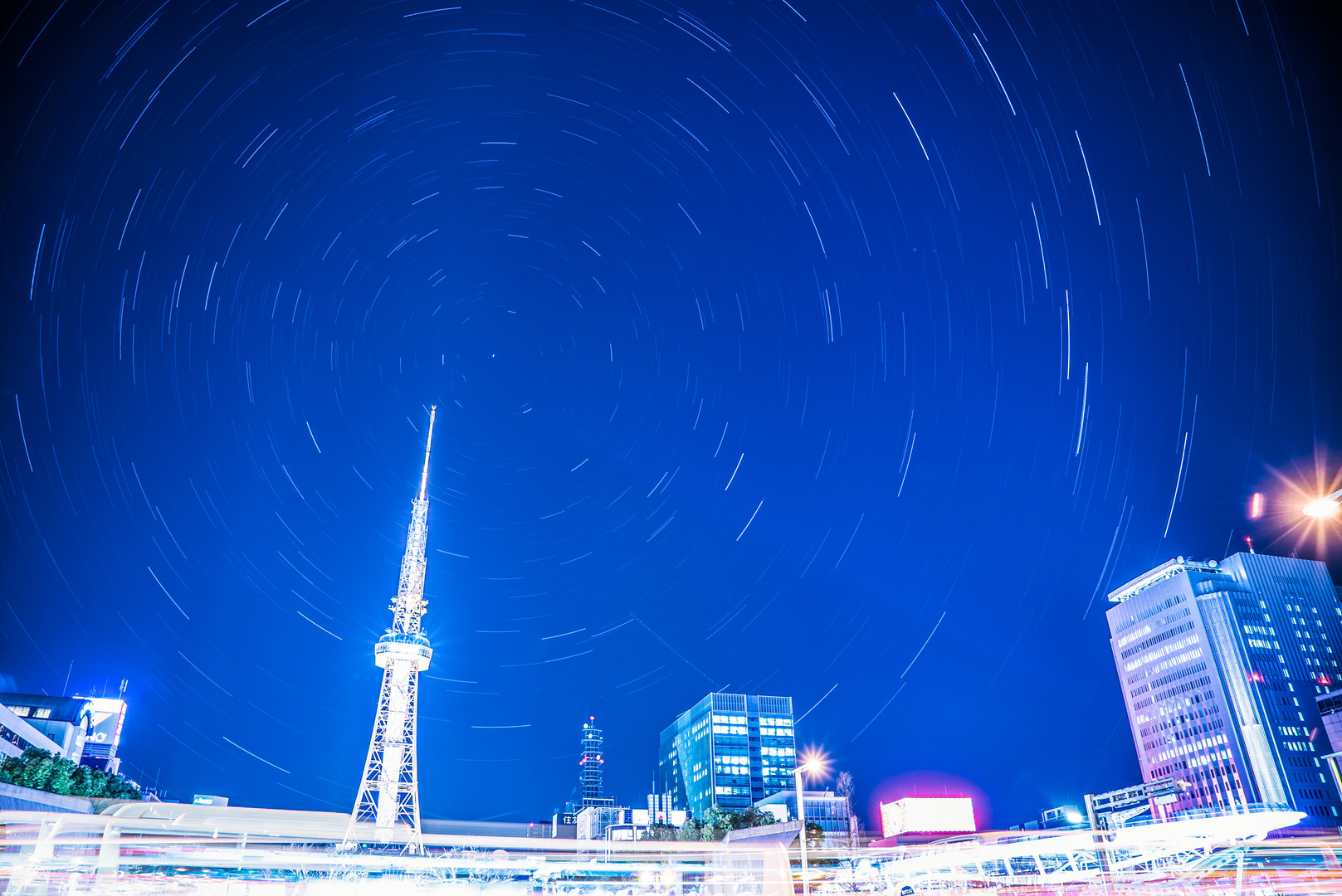 とても晴れた夜でした。 名古屋市栄にて撮影。非常に寒かったのですが、空気も澄んでいました。 初めて挑戦した比較明合成です。 200枚(1時間分)をコンポジット。