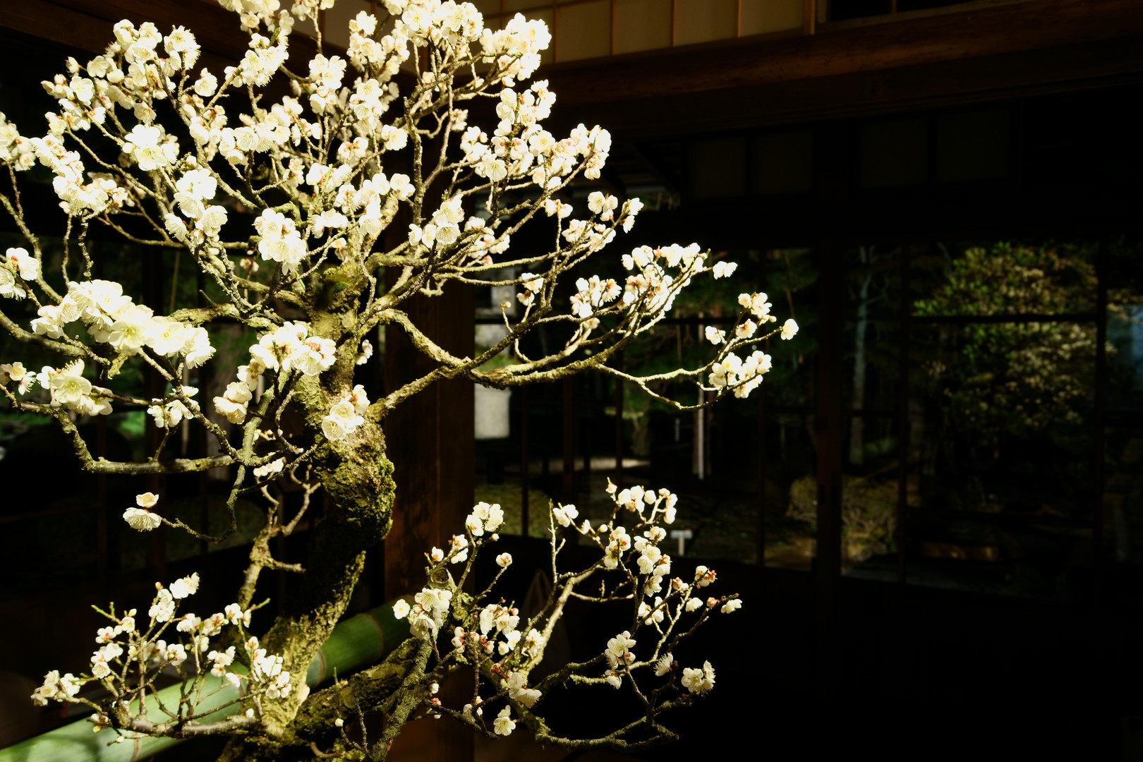 長浜市で開催されている盆梅展。写真は2枚ですが、こちらはライトアップされた中での梅です。梅ばかり見ていたんですが、ふと外を見ると白い梅が窓に映っていたので両方を入れて撮影しました。