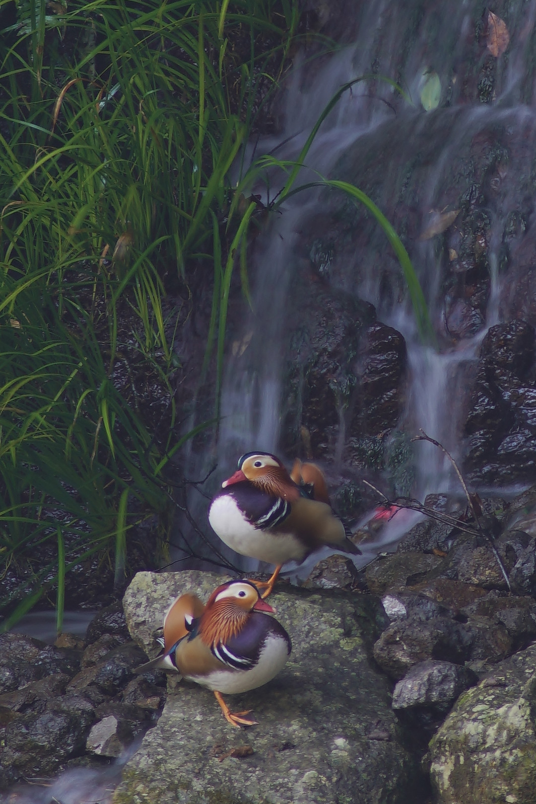 沢の小さな滝背景で、ひと工夫してみました。#オシドリ#