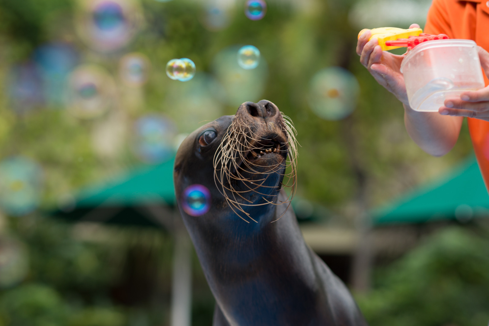 水族館での一コマ。シャボン玉に夢中のアシカ!