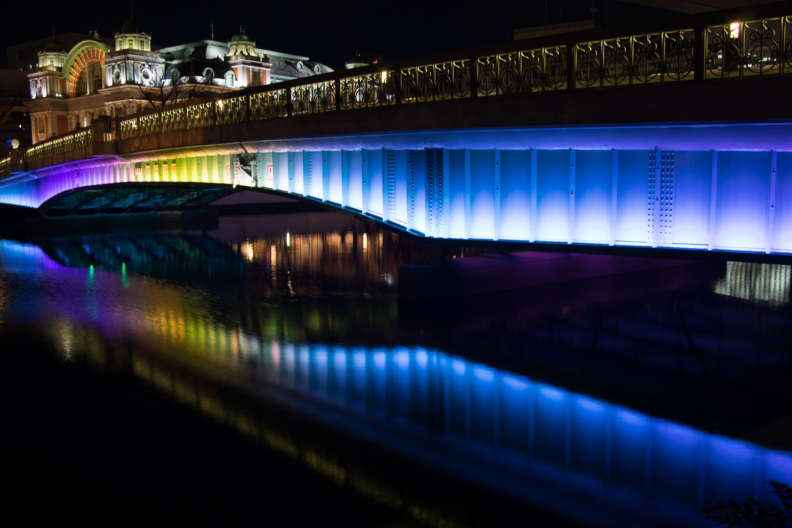 ライトアップされた橋。 橋をライトアップする光が時間とともに変化する様子を写しこみつつ、 水面がざわつかないように、適度に長時間露光を行いました。