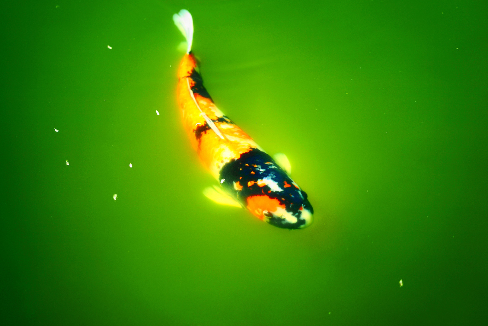 緑の水の中で輝く鯉 雀も陽気に舞ってます。