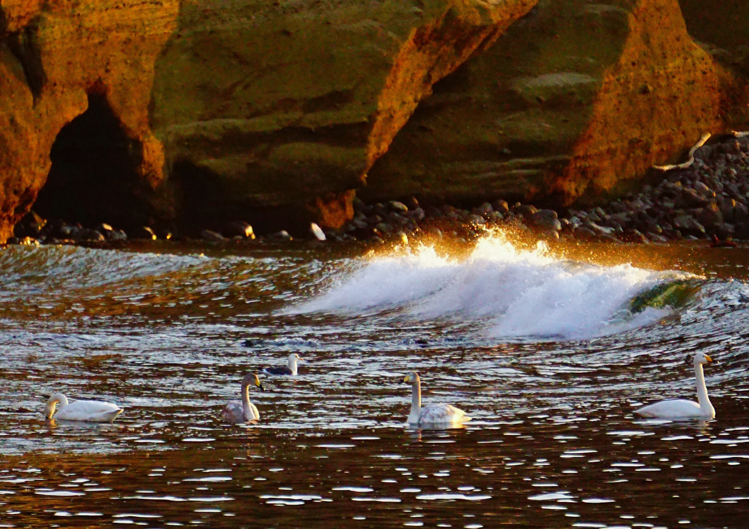 40年住んでいるが、この海岸で白鳥を見るのは初めてです。 あわててカメラを構えると、沖の方に行く様子。 その時、見慣れたカモメが白鳥の近くに着水。 浅瀬に近づき海面に首を突っ込み、なにか食べてる様子。 暫くカモメが付き添い、案内しているようでした。