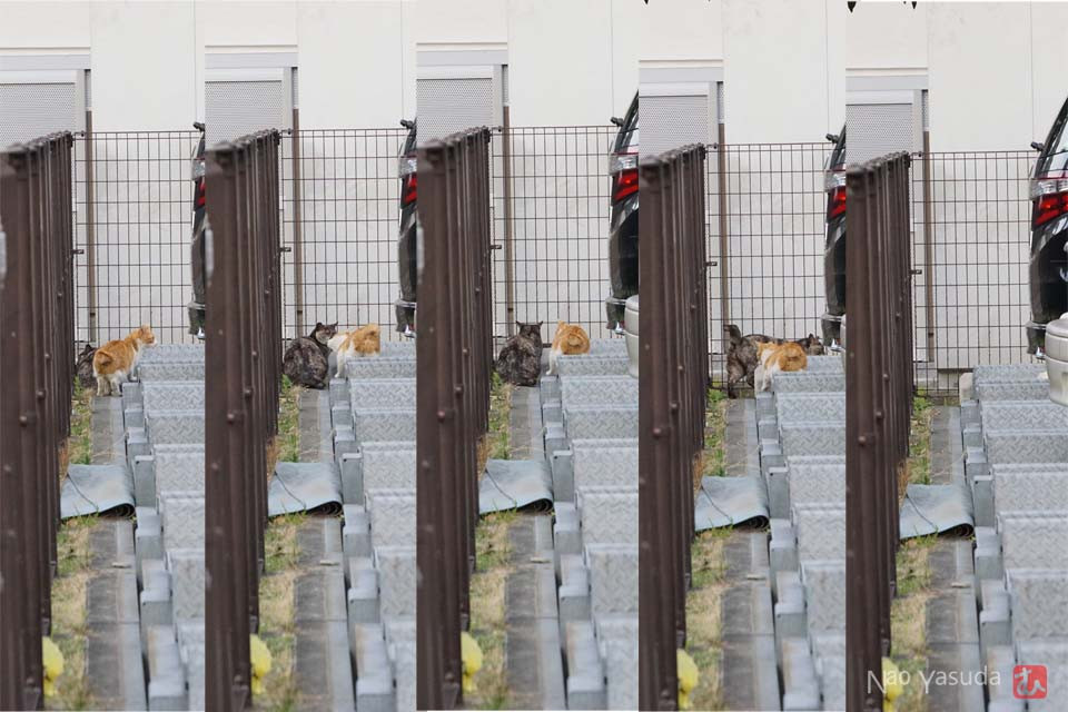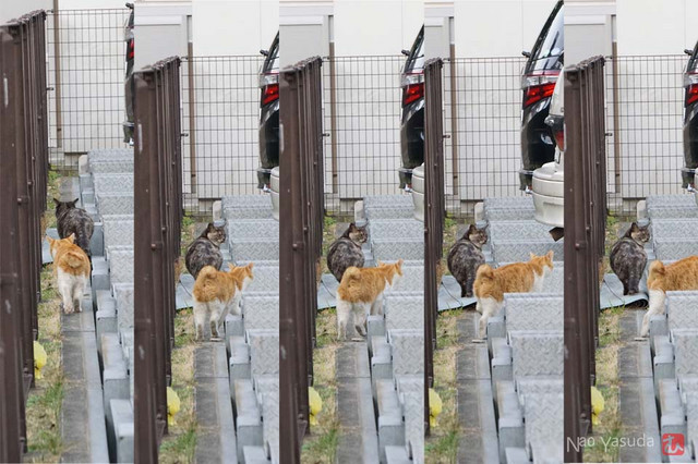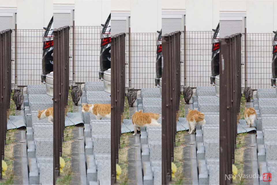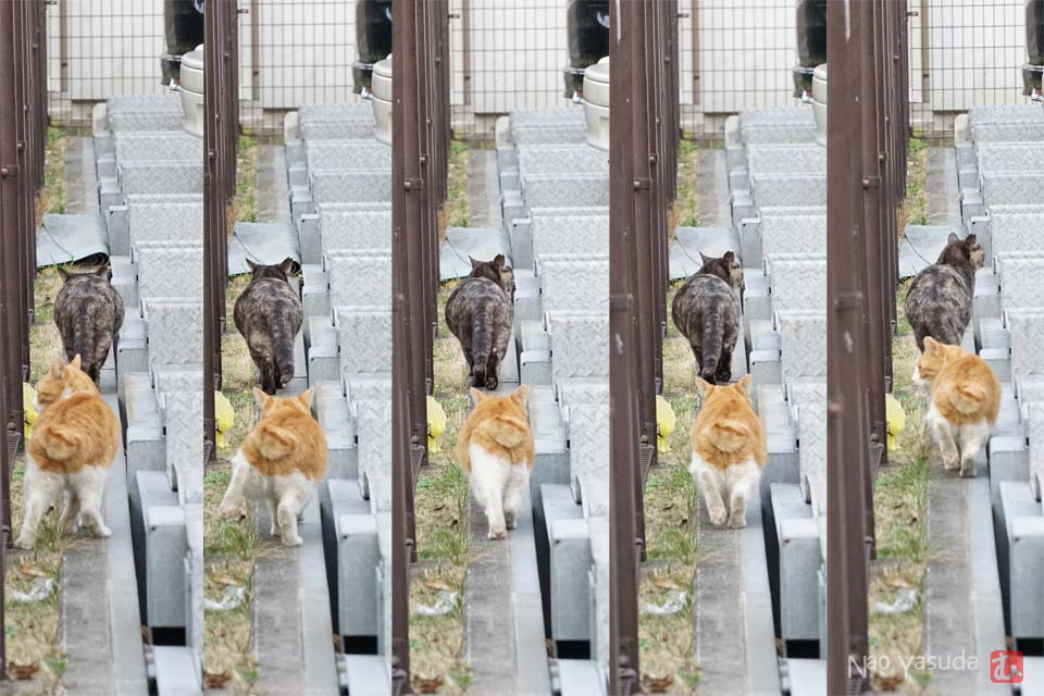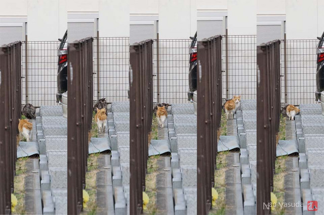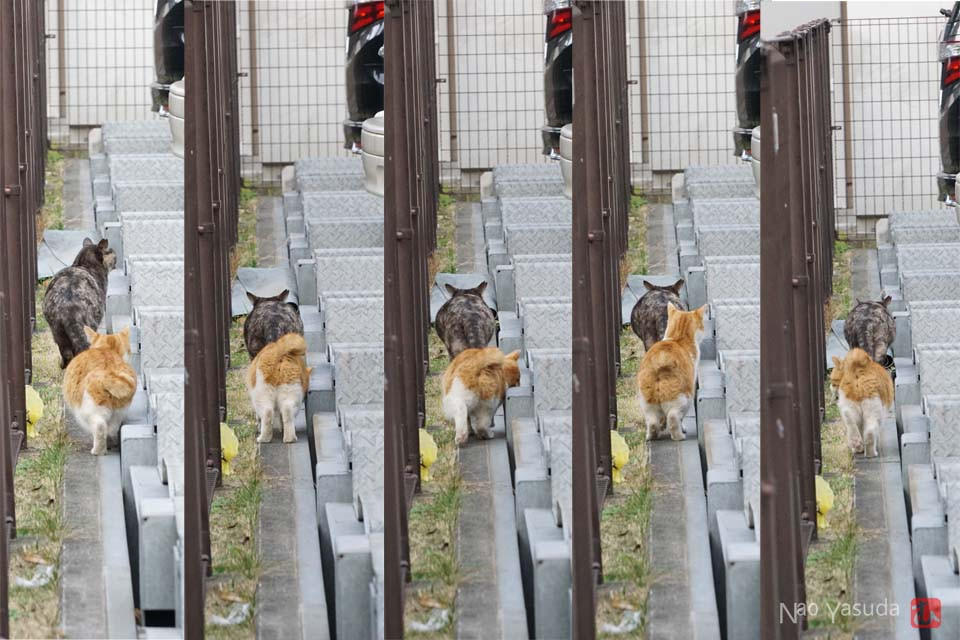 茶トラさんが追いついたので再び歩きだすコワモテさん。